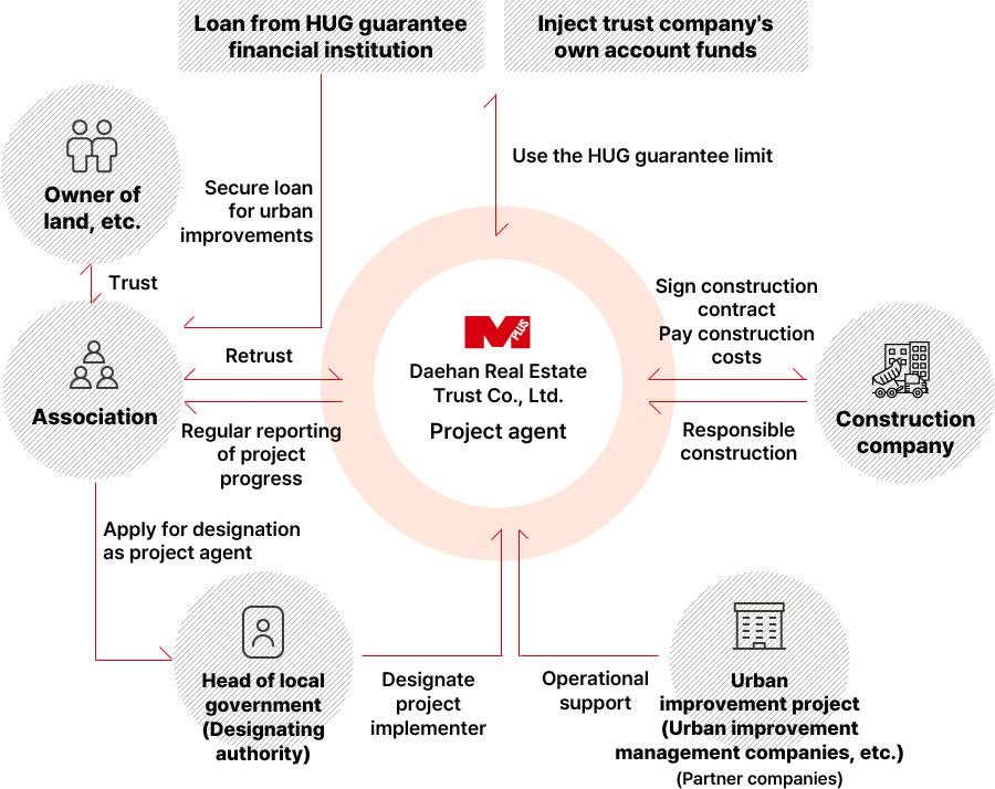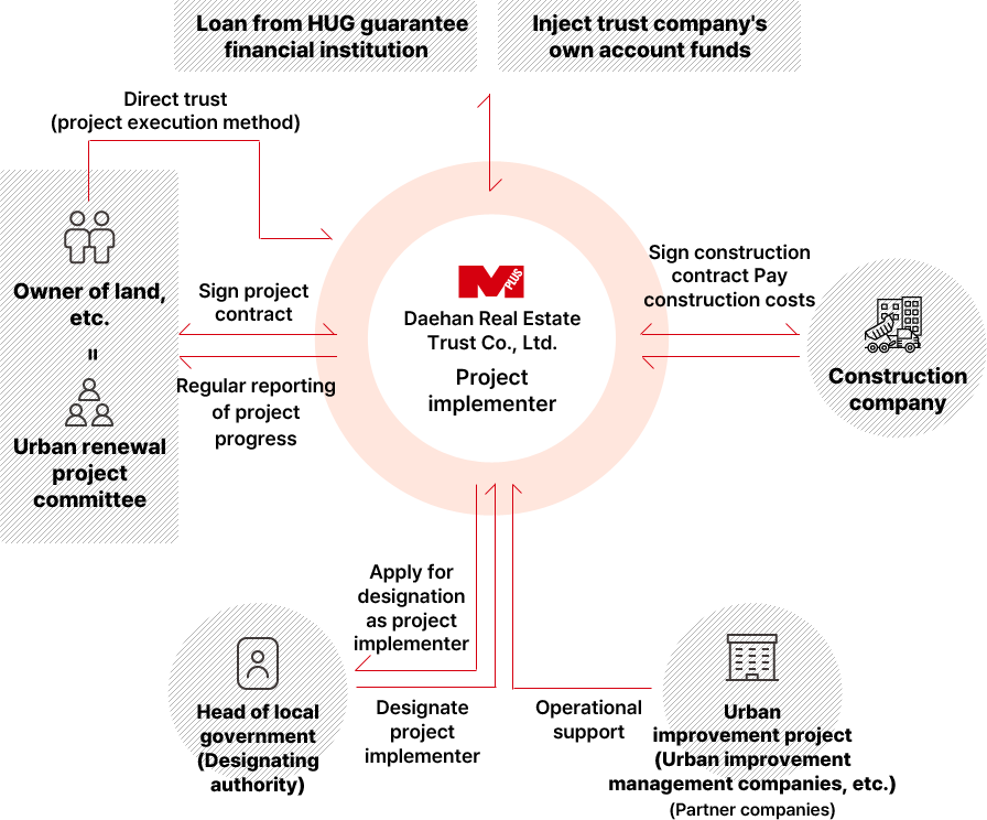 A trust-based urban improvement project refers to a project method where Daehan Real Estate Trust swiftly, transparently, and professionally handles all tasks from funding to operation when carrying out reconstruction or redevelopment projects in areas that need urban function restoration or have poor living environments, in compliance with procedures stipulated by the "Act on the Improvement of Urban Areas and Residential Environments."